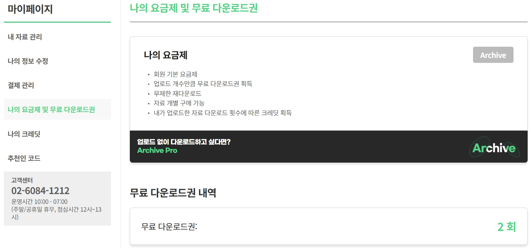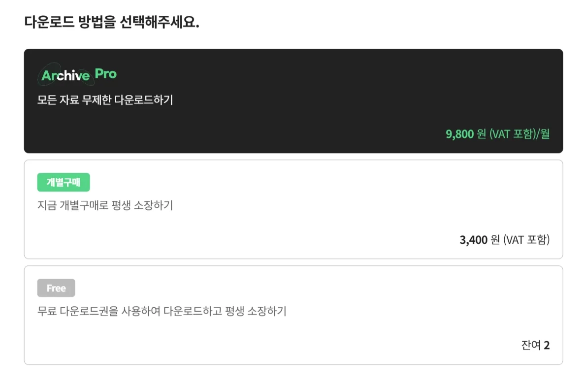 Free와 개별구매 방식은 사이트 내 무제한 재다운로드가 가능하지만, Archive Pro는 구독 취소 시 사이트 내 재다운로드가 불가합니다.